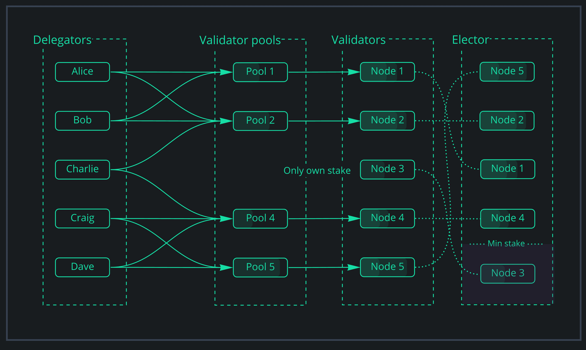 Delegators play an important part in the decentralization of the network. By staking to validators, they enhance network security and offer direction to the Elector's algorithm on which validators should move forward to the next round. This enables low stake validators who are well-regarded by the community to accumulate funds in their pools and become validators.